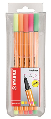 - 5 Stabilo 88 pens - wallet set - water-based - fineliner -.4mm tip - neon colo